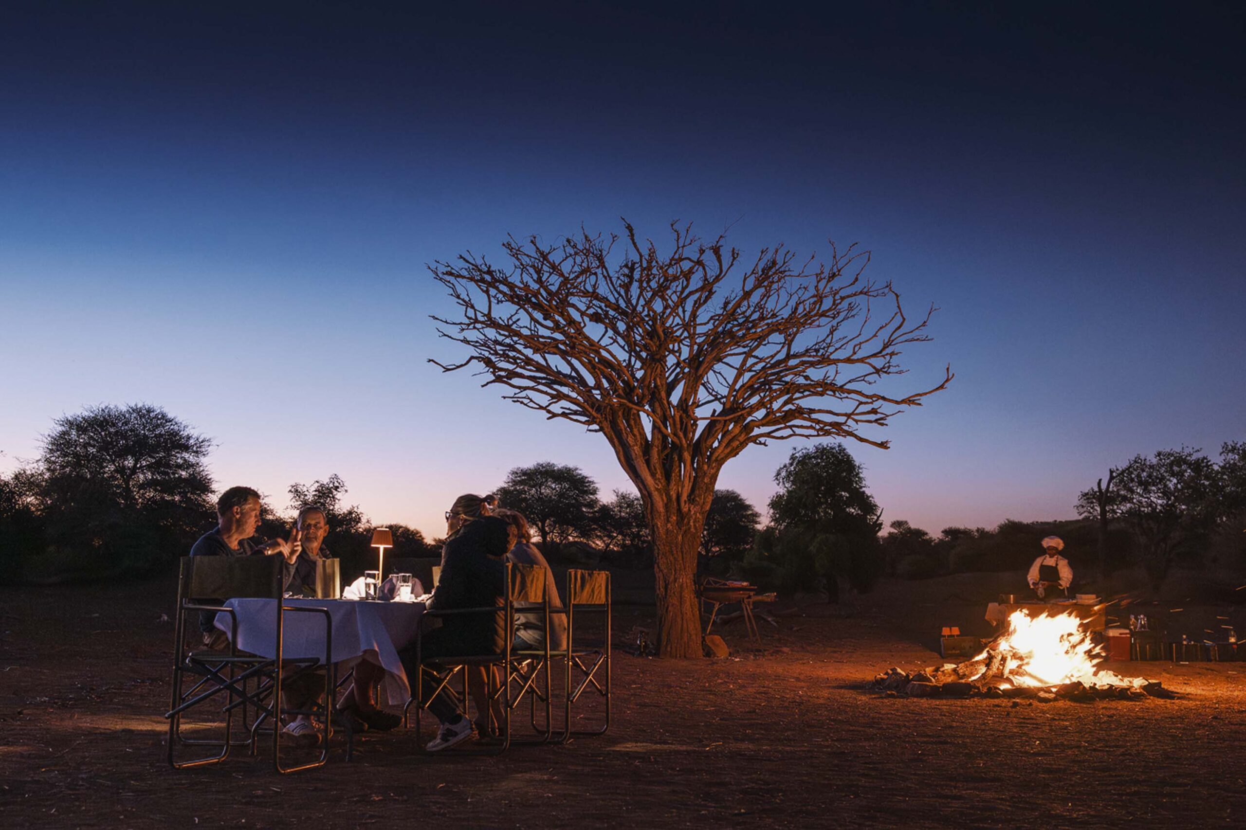 As the sun dips low, you might be invited for a sundowner beneath an ancient mopane tree, or later, a gourmet Bush Dinner Experience Namibia beneath the stars. Lanterns glow, the night hums softly, and for a few timeless hours, nature hosts you in her most elegant dining room for an unforgettable Outdoor Dining in the Wilderness session. This fusion of luxury and nature is what defines our Bush Dinner Experience Namibia, ensuring that every meal supports our Sustainable Safari Dining mission.